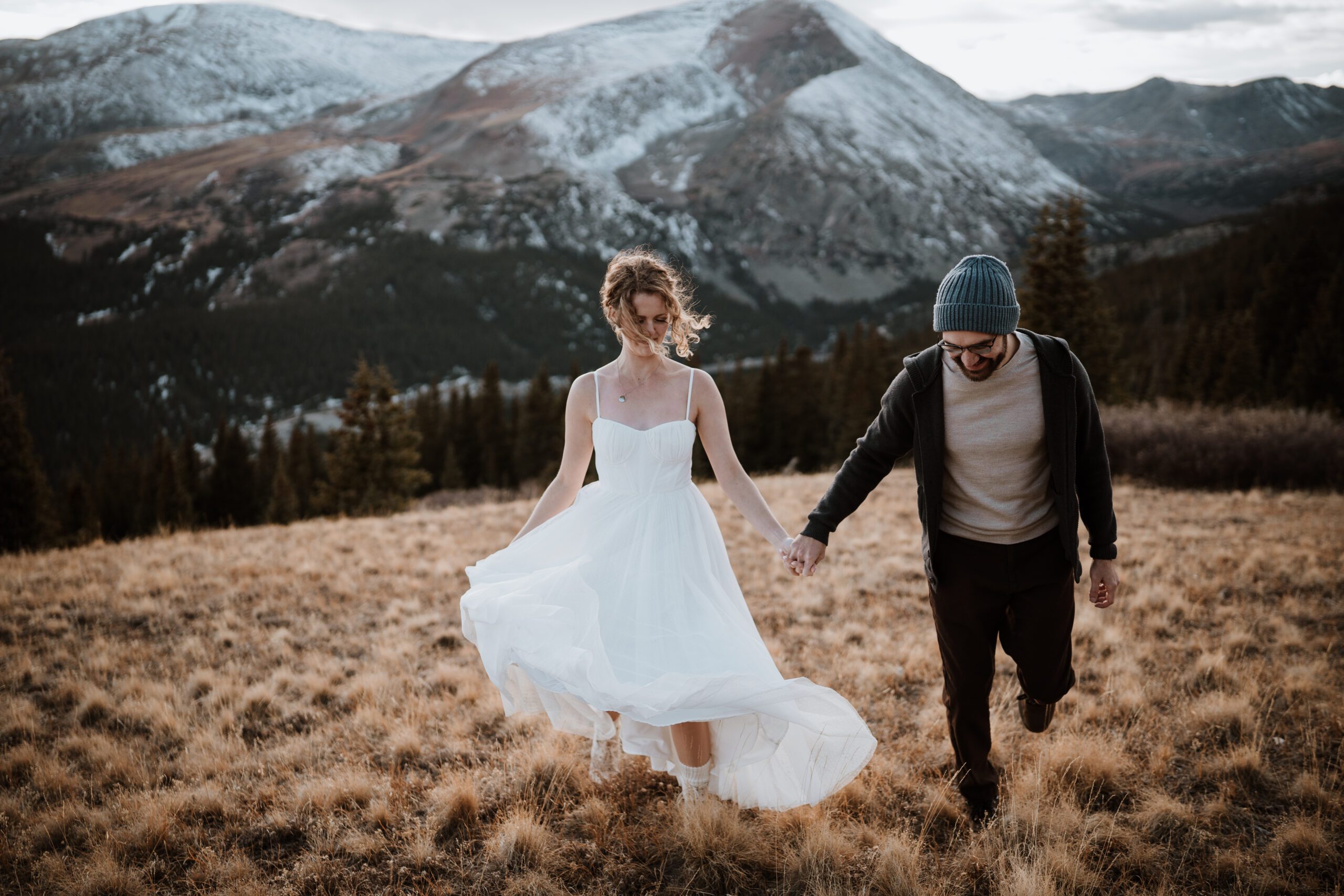Let’s set the scene. Our favorite Colorado mountains towering in every direction, the wind catching just enough to send Megan’s dress flying, and Matt looking at her so sweetly, like she was the prettiest girl on the mountain (can confirm: she was).